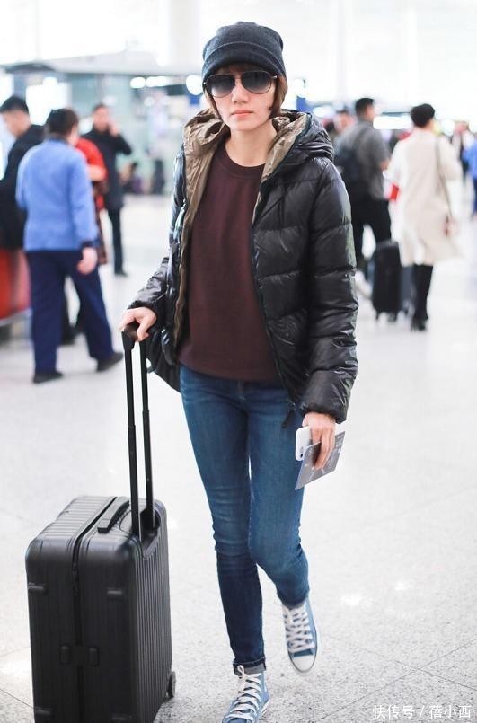 外面叠的黑色亮面羽绒服也很时髦,短款不压个子,亮面看着不臃肿,敞开穿让酒红卫衣露个领口,让厚重的冬装也有了轻盈感,再看她脚上的蓝白帆布鞋一搭,休闲感就出来了,不会像穿靴子那么厚重。