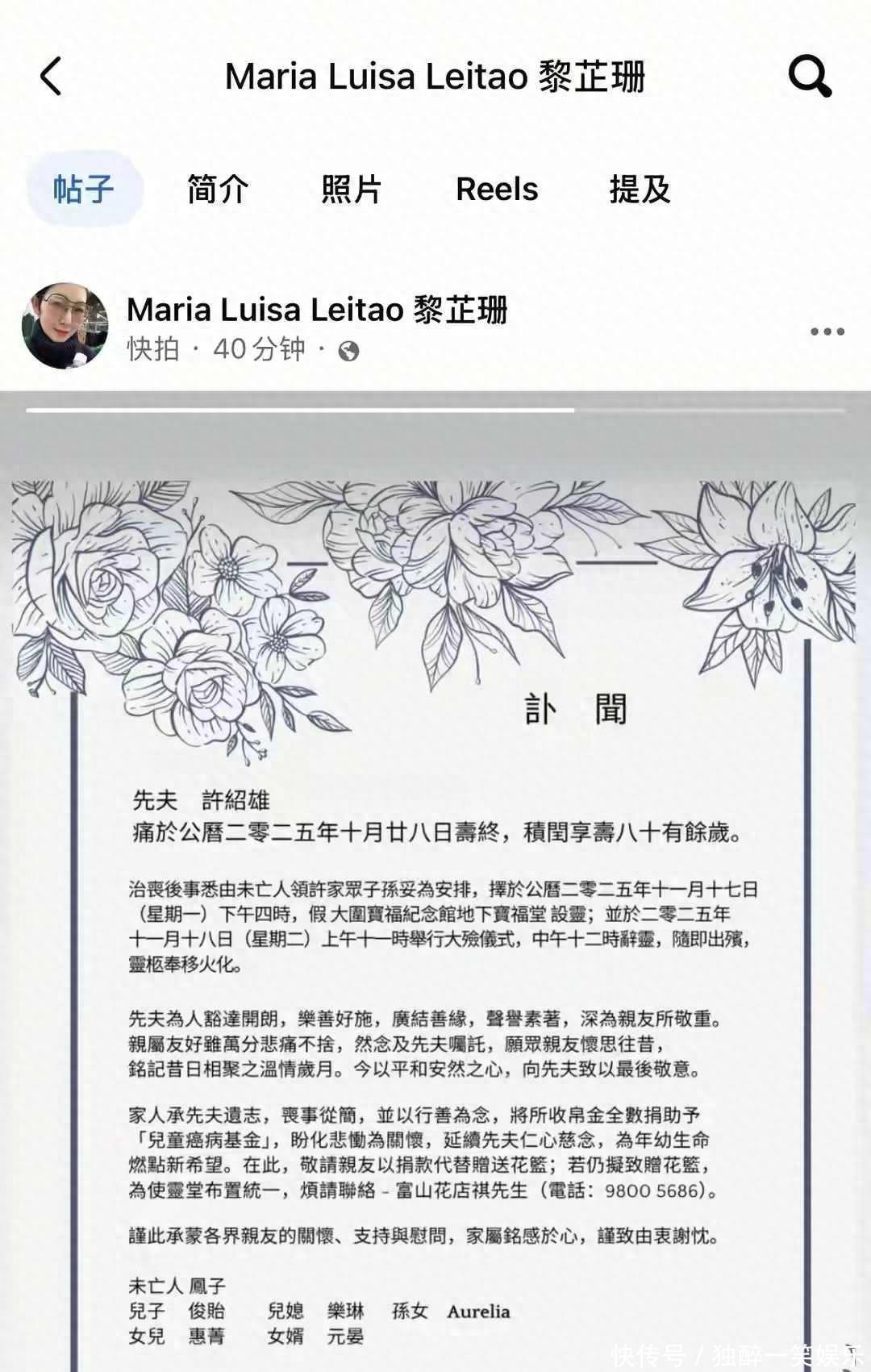 10月31日,黎芷珊替家人发了讣告,说11月17日下午设灵堂,第二天办大殓和出殡,许绍雄的太太会带着孩子和孙女一起出席,家人希望亲友别送花篮,改捐钱,所有善款都会给儿童癌病基金会。